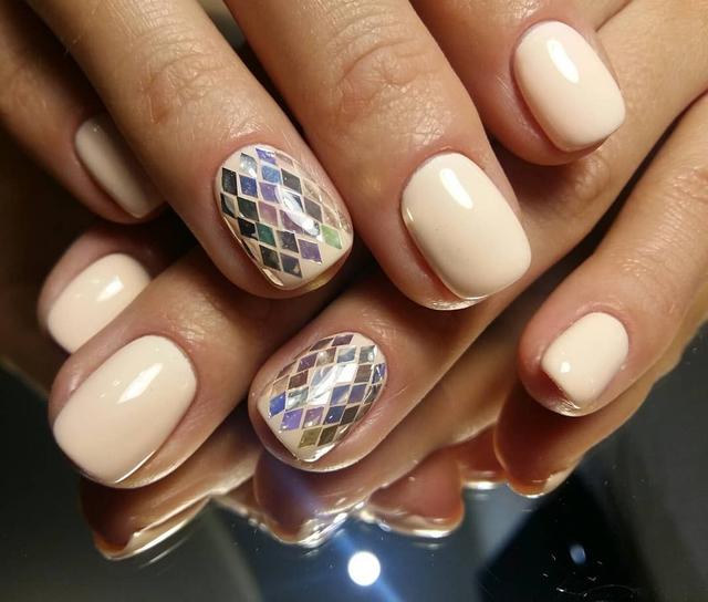● битим склом - викладаються цікавими композиціями як на спокійних нюдовый тонах або безбарвних засадах, так і на яскравих відтінках лакових покриттів;