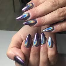 Пудра з ефектом північного сяйва дуже схожа на вищезгадану, але відрізняється своєю холодною гамою кольорів. Для створення такого манікюру необхідно використати основу синіх, фіолетових або смарагдових тонів.